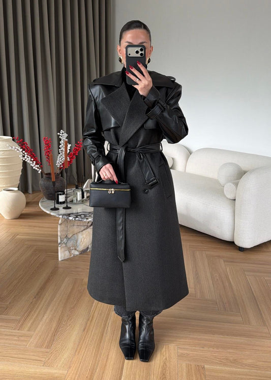3 AL 2 ÖDEOmuzu Deri Detaylı Uzun Kaban SİYAH
