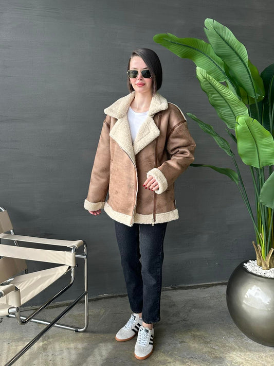 3 AL 2 ÖDEDeri Biyeli Kürk Ceket CAMEL
