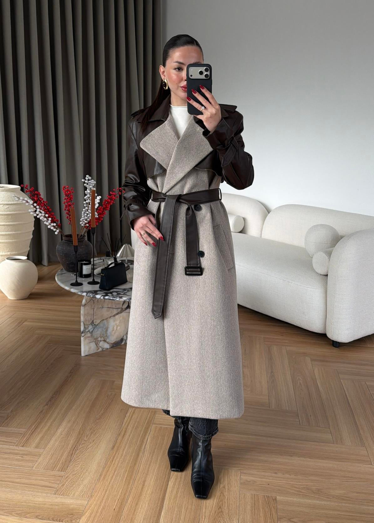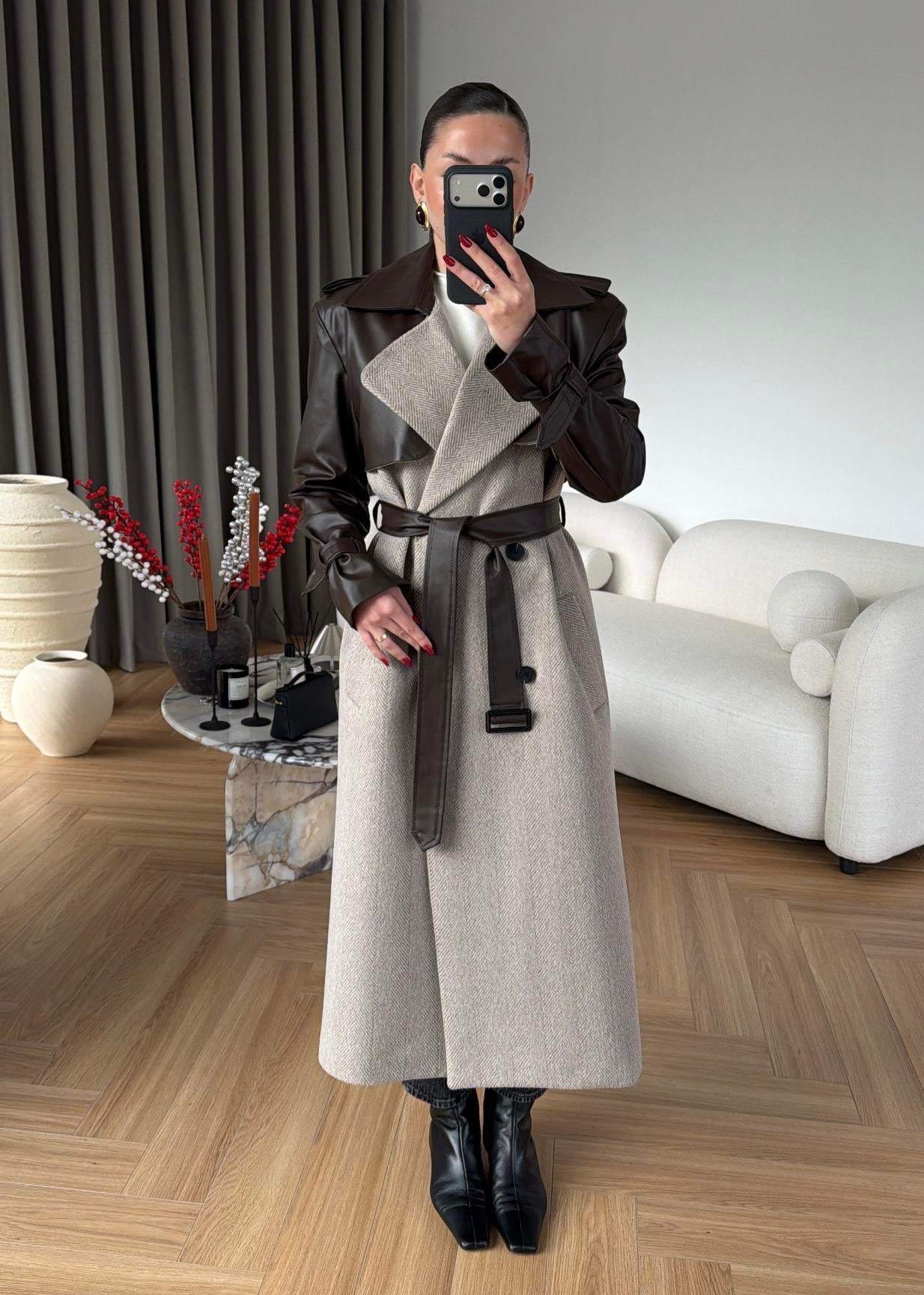 Omuzu Deri Detaylı Uzun Kaban ACI KAHVE