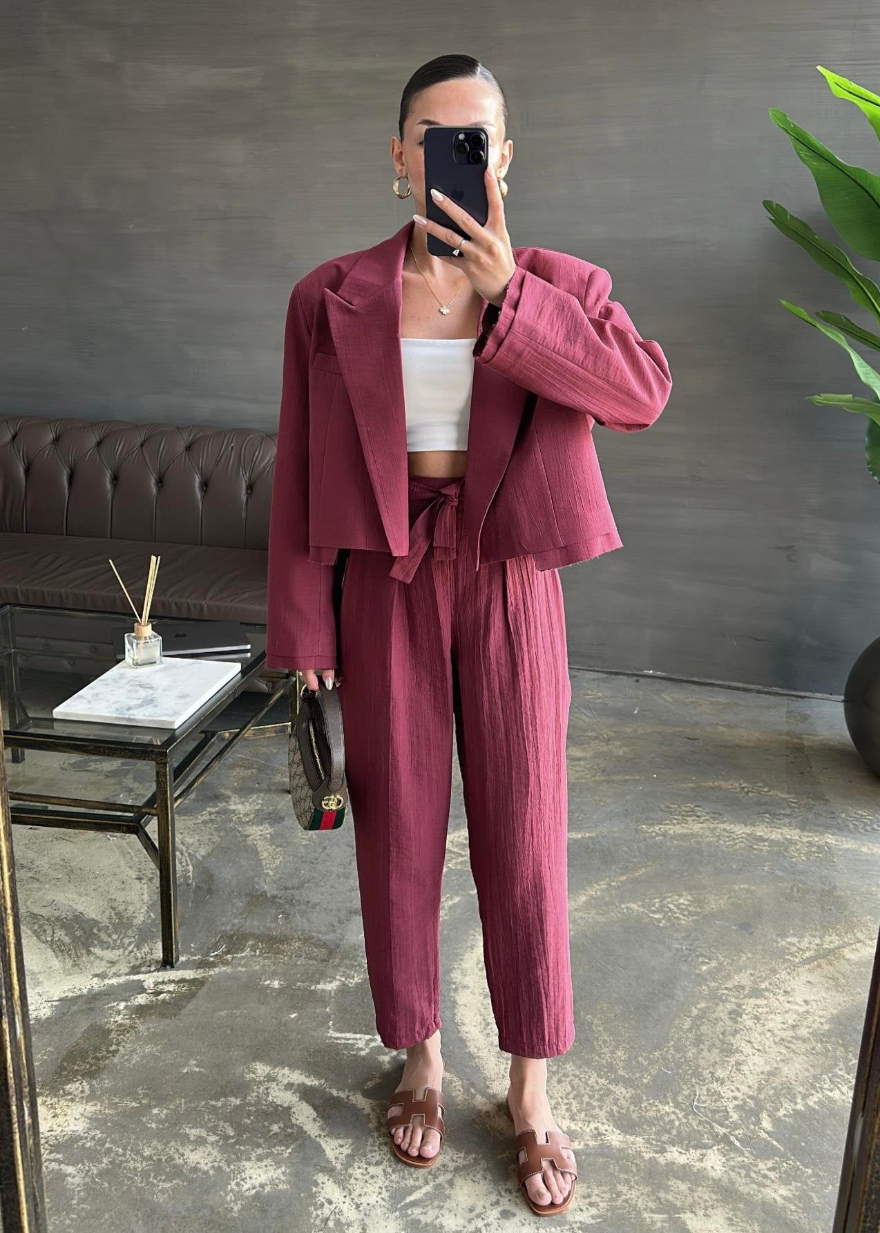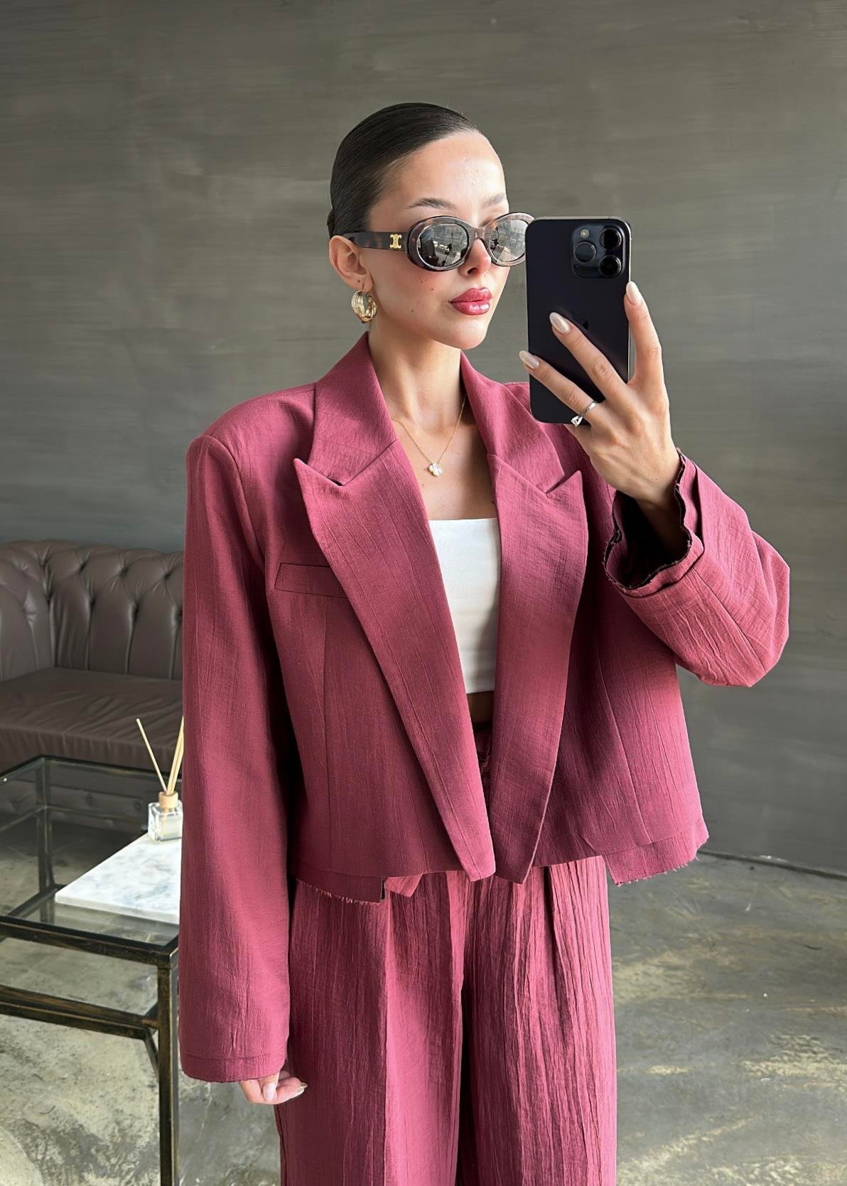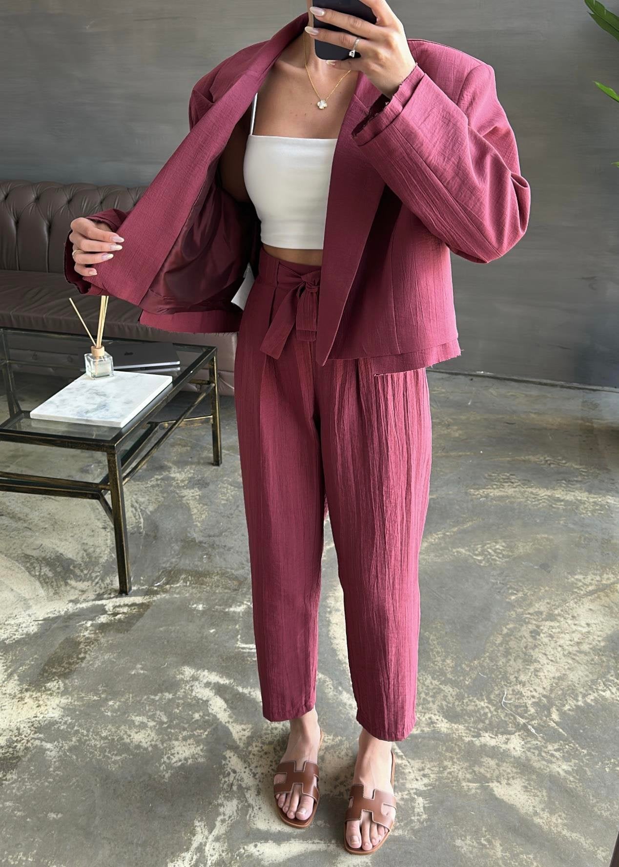 Bağlama Detaylı Crop Ceketli Takım BORDO