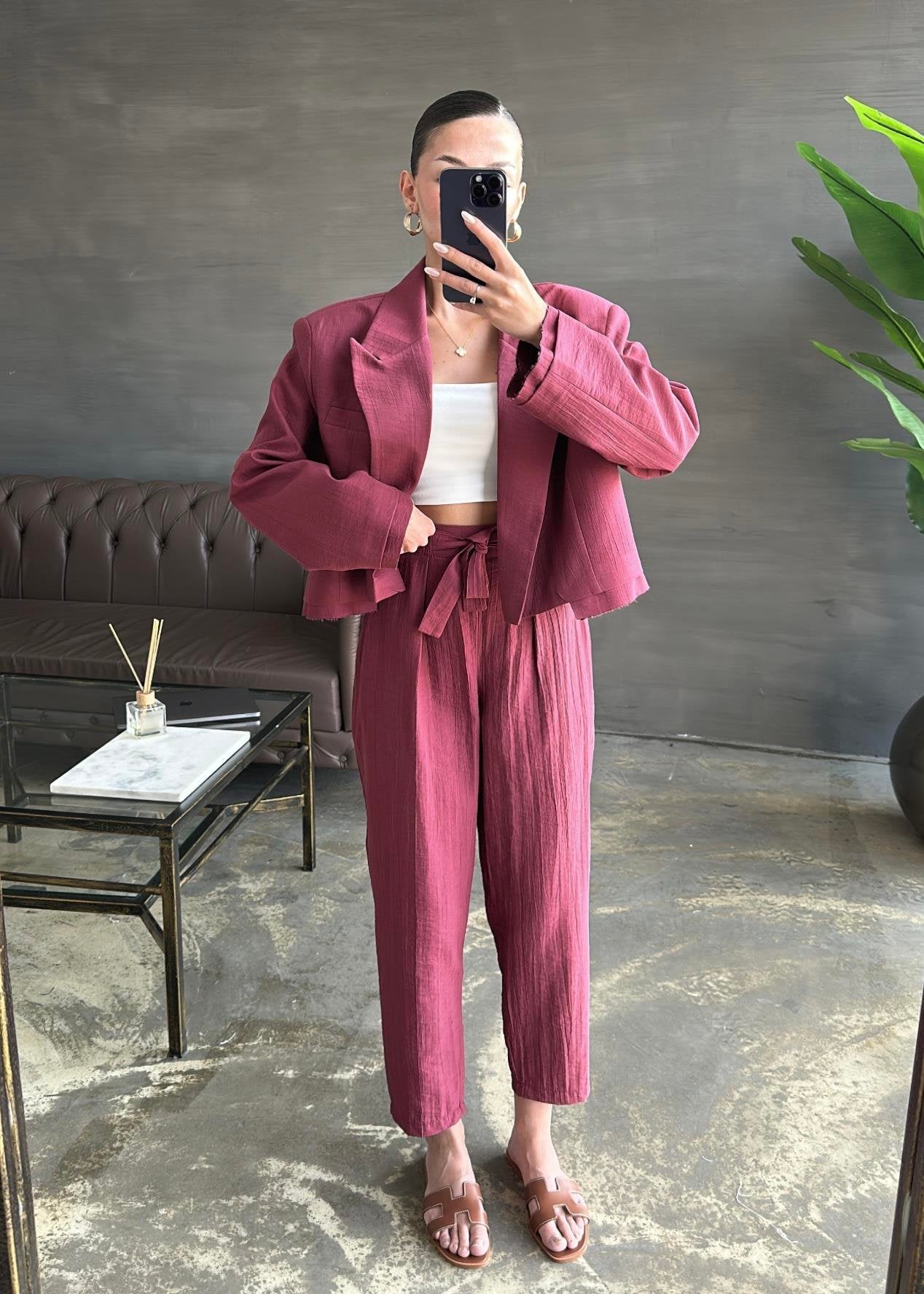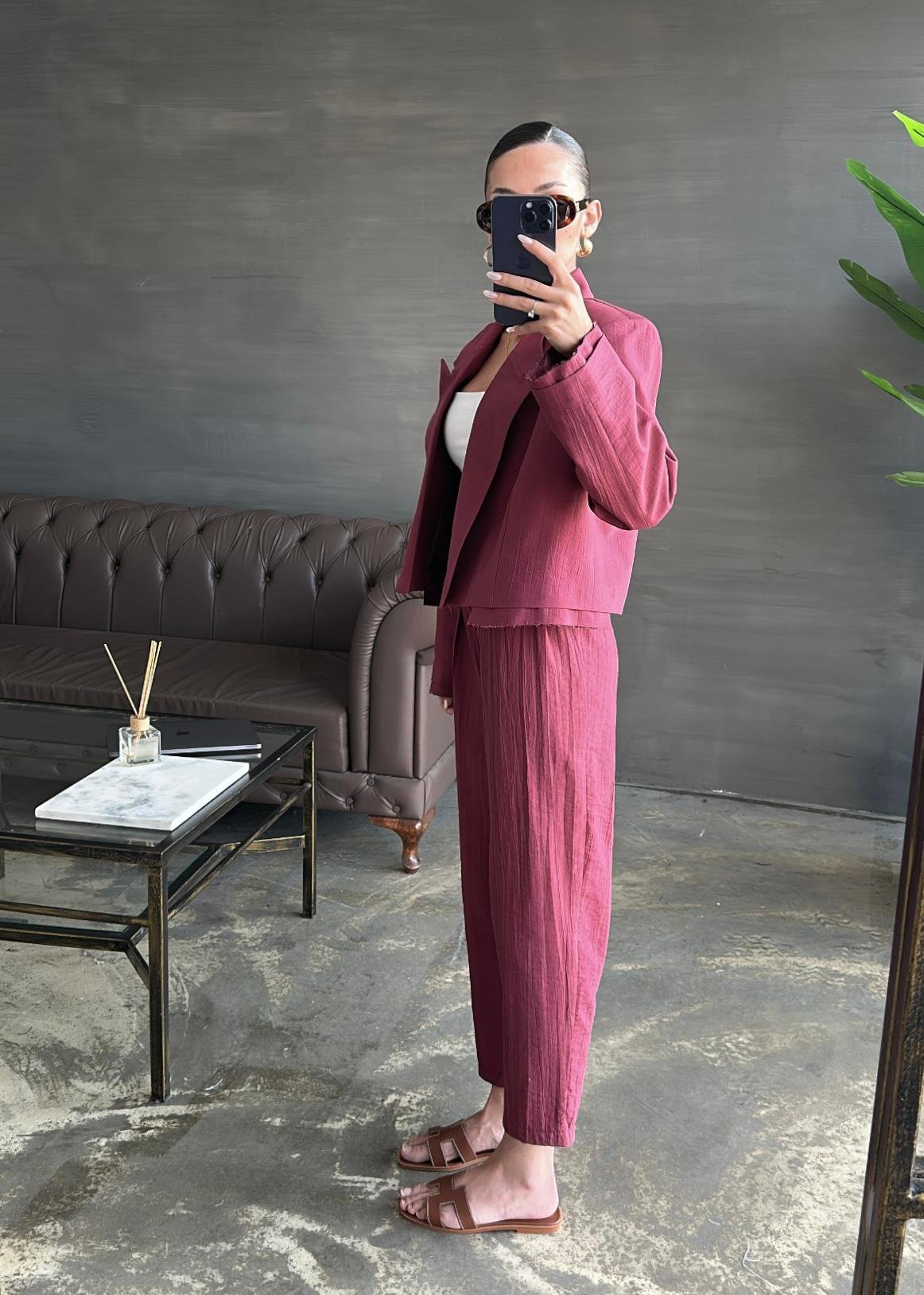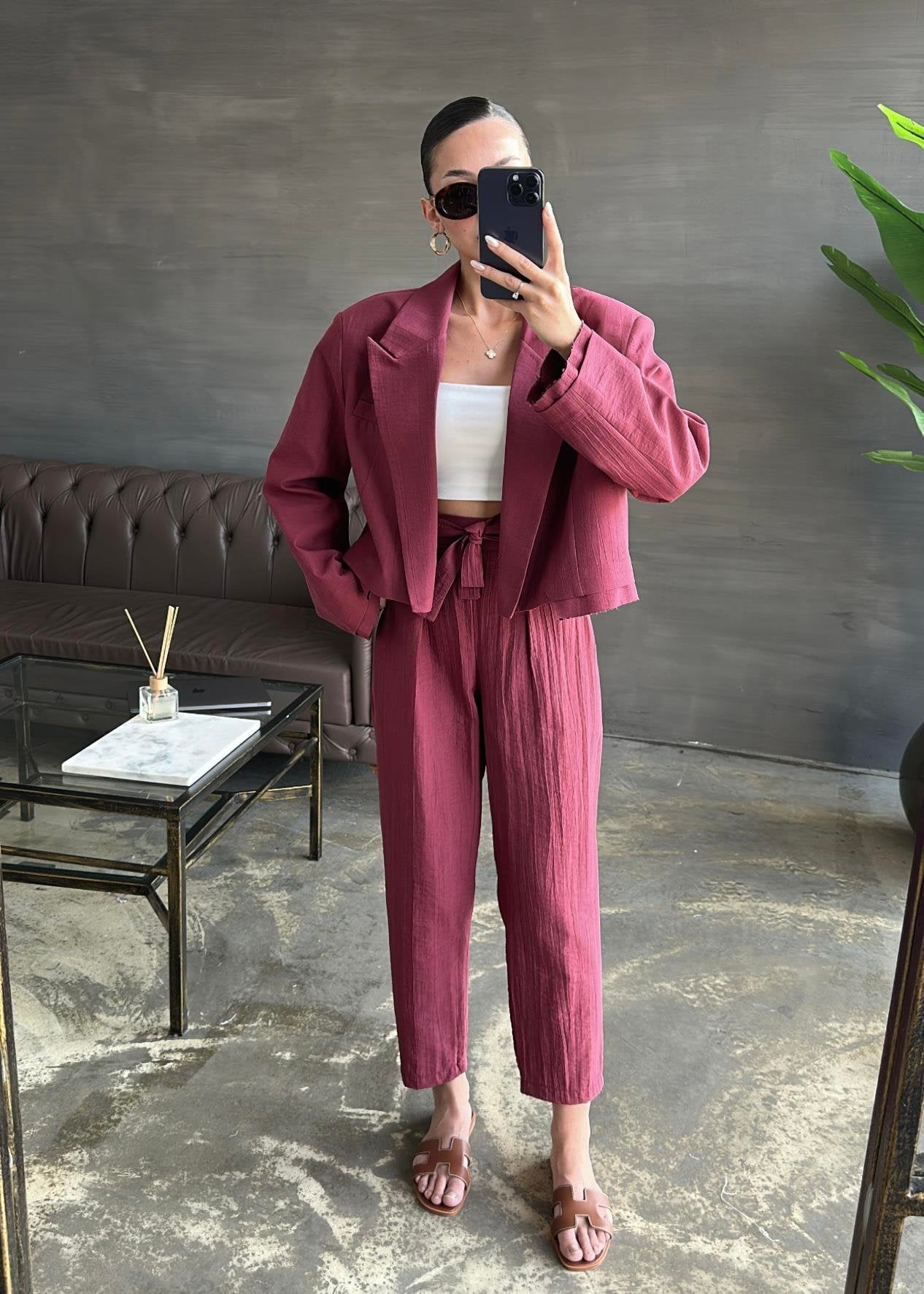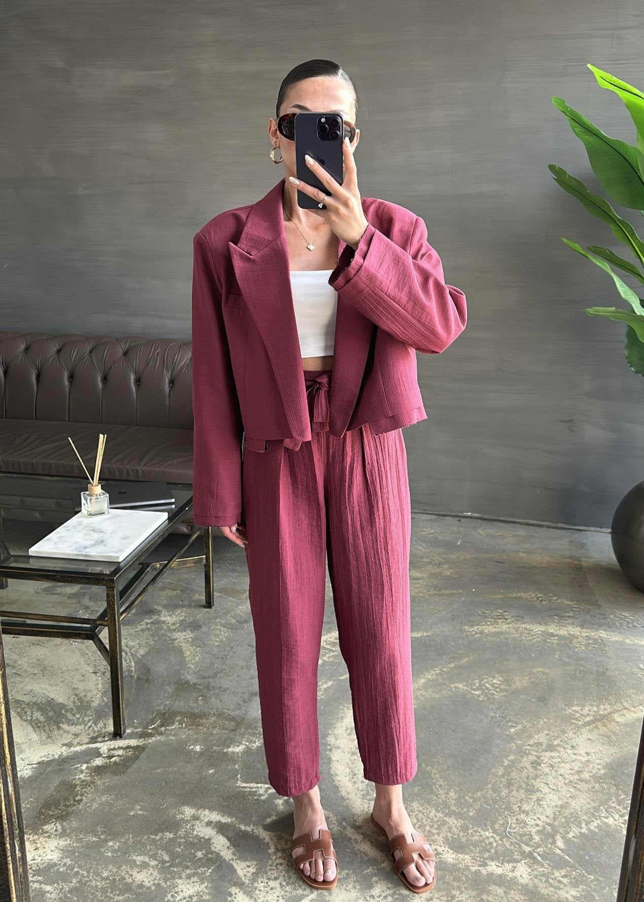 Bağlama Detaylı Crop Ceketli Takım BORDO