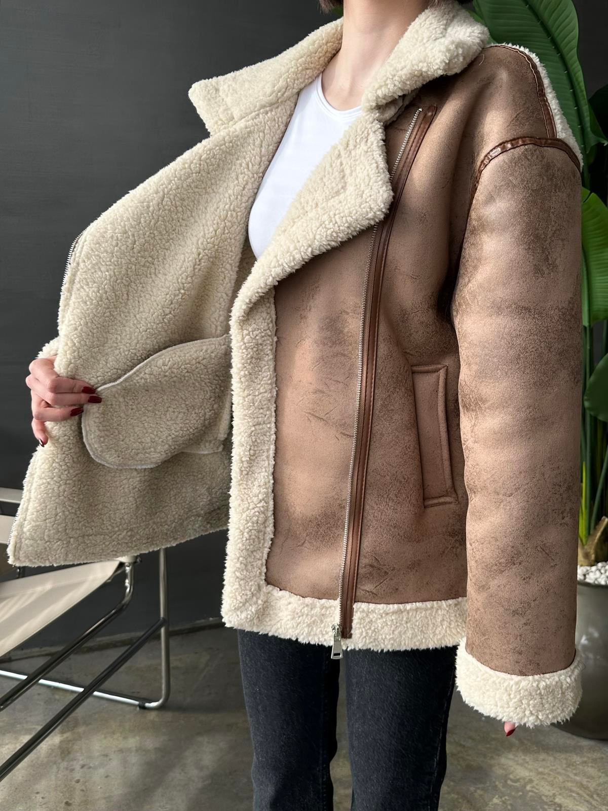 Deri Biyeli Kürk Ceket CAMEL