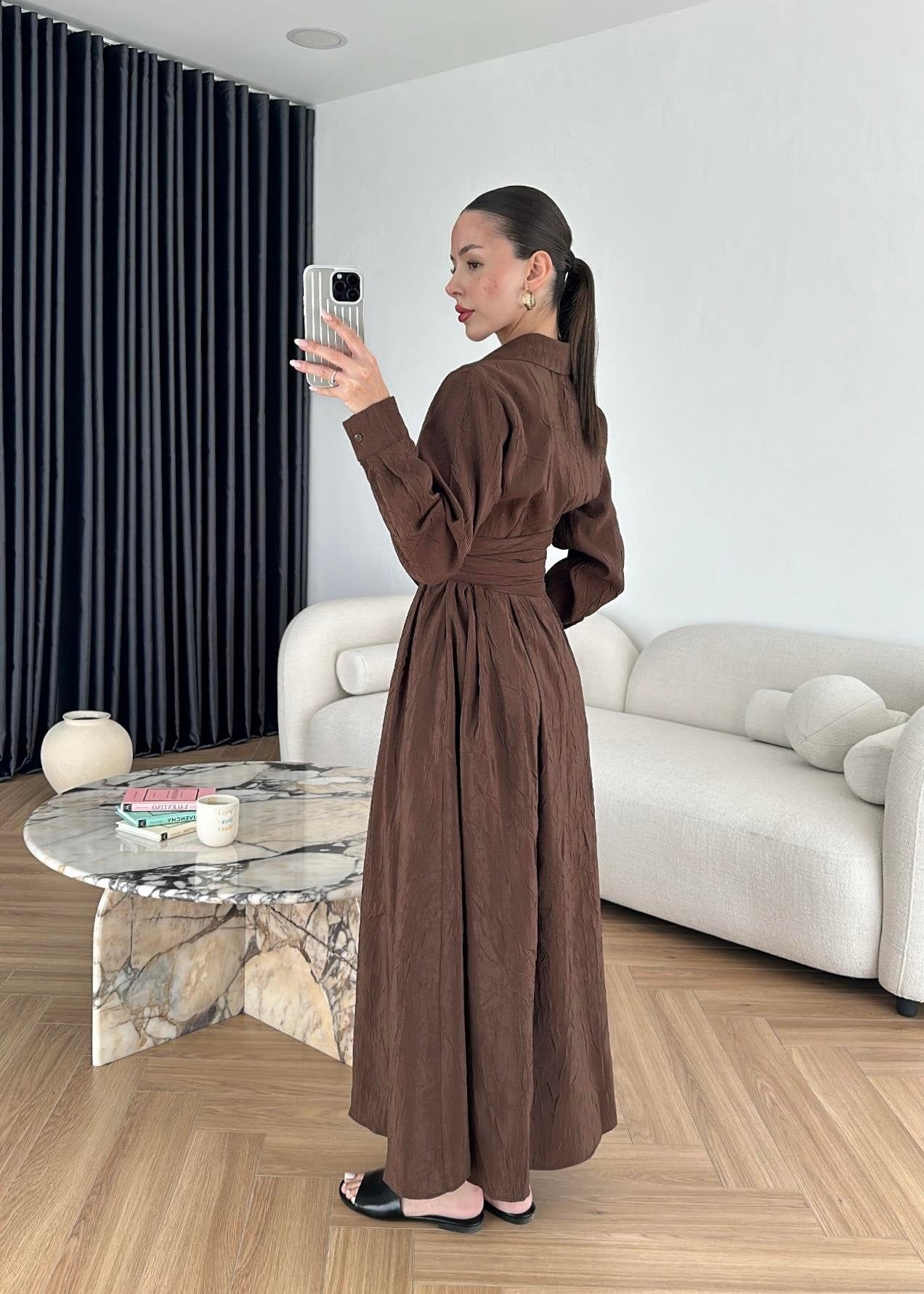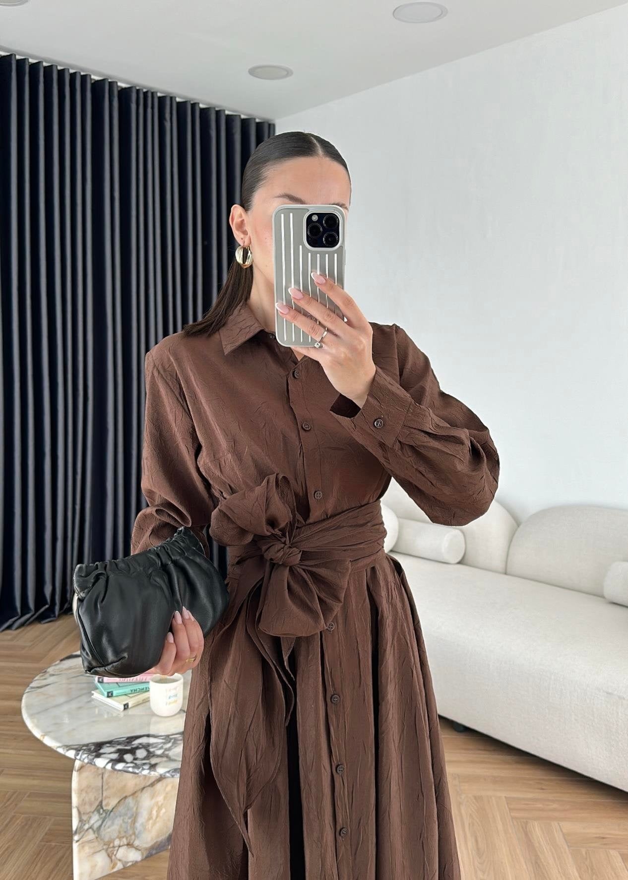 Kraşlı Beli Bağlamalı Elbise KAHVERENGİ