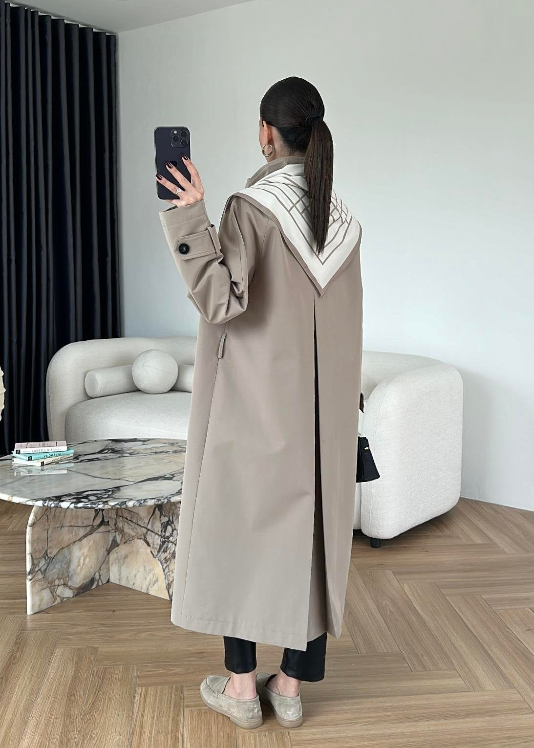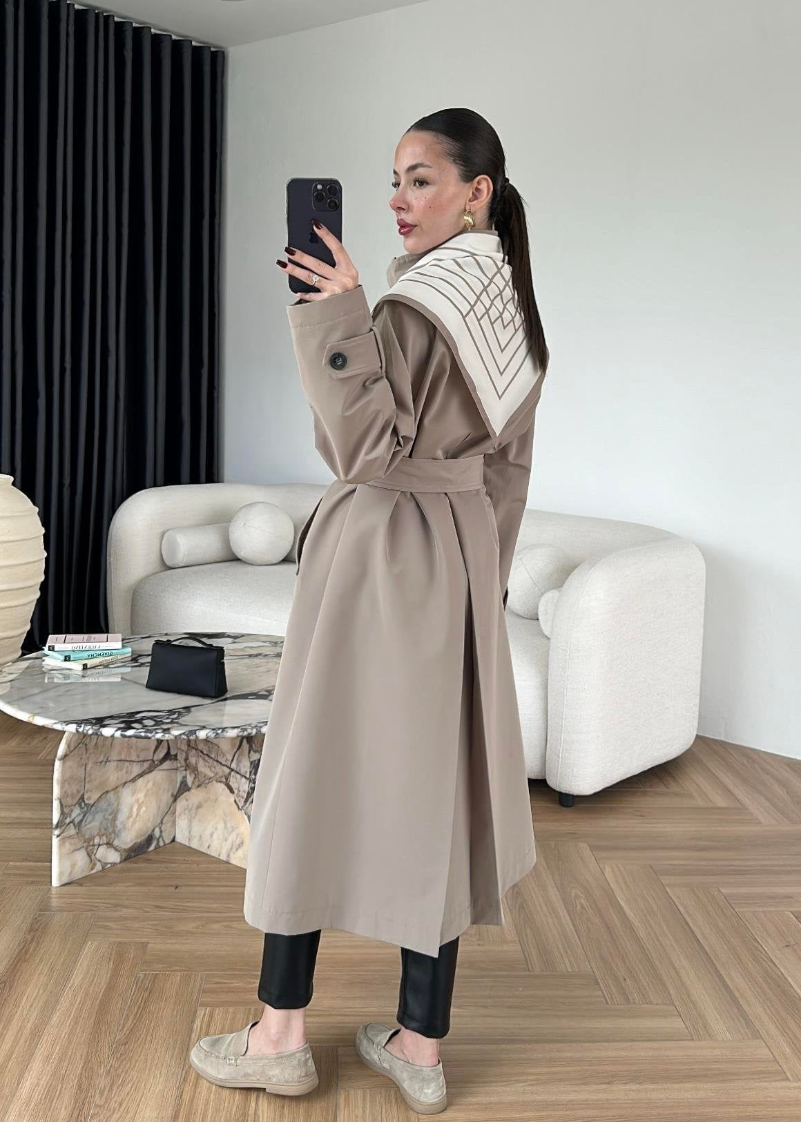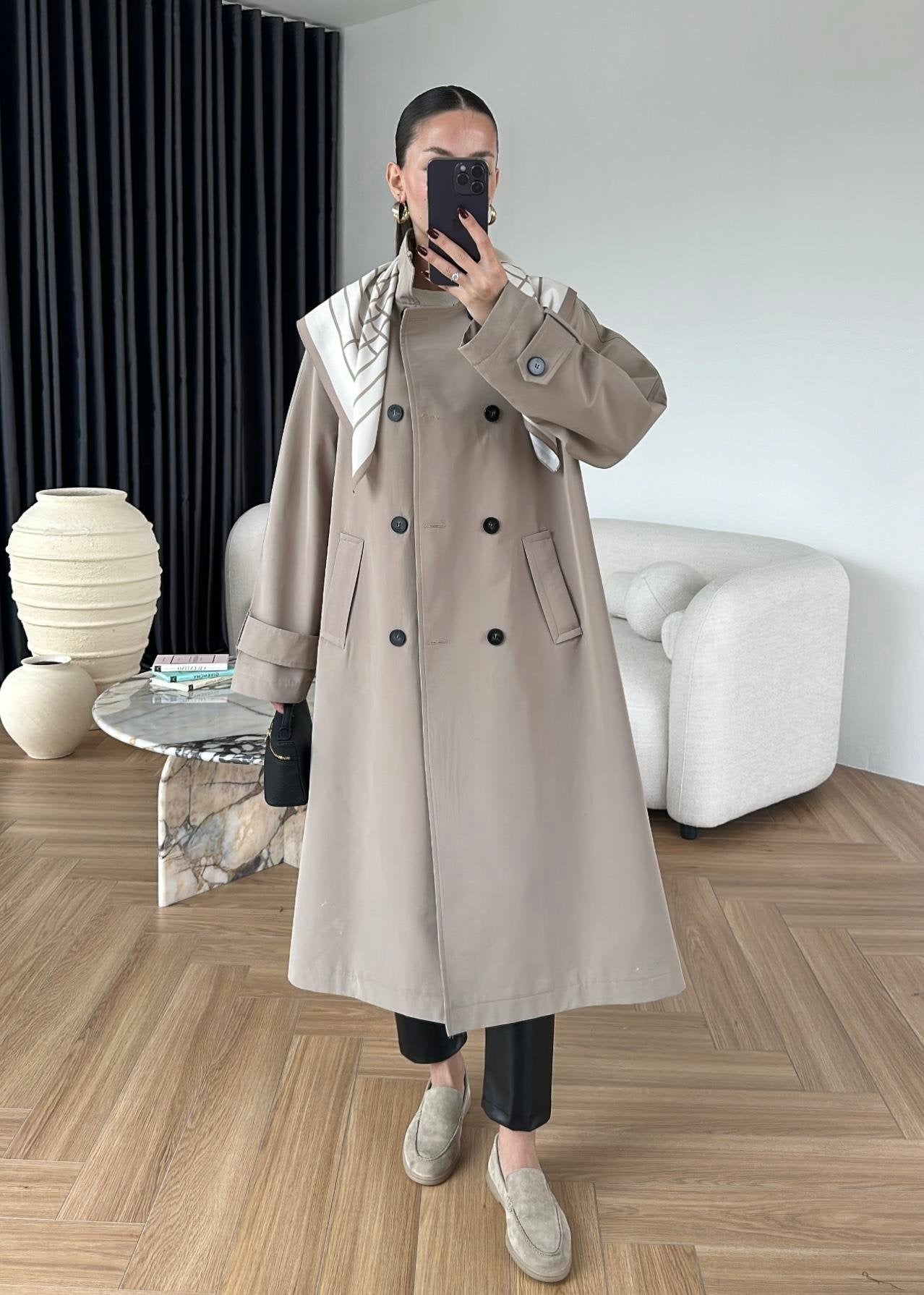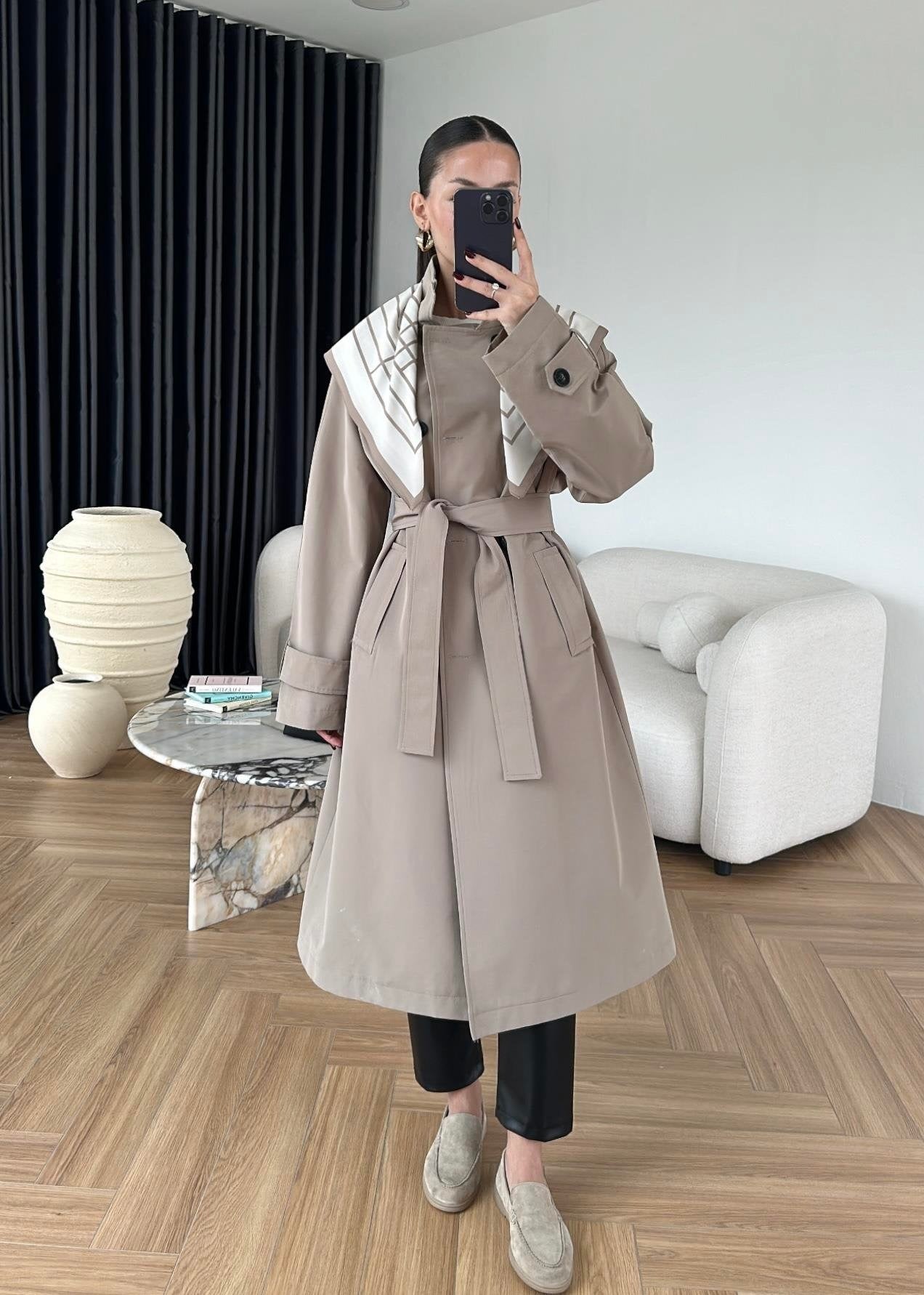 Fularlı Uzun Trençkot TAŞ