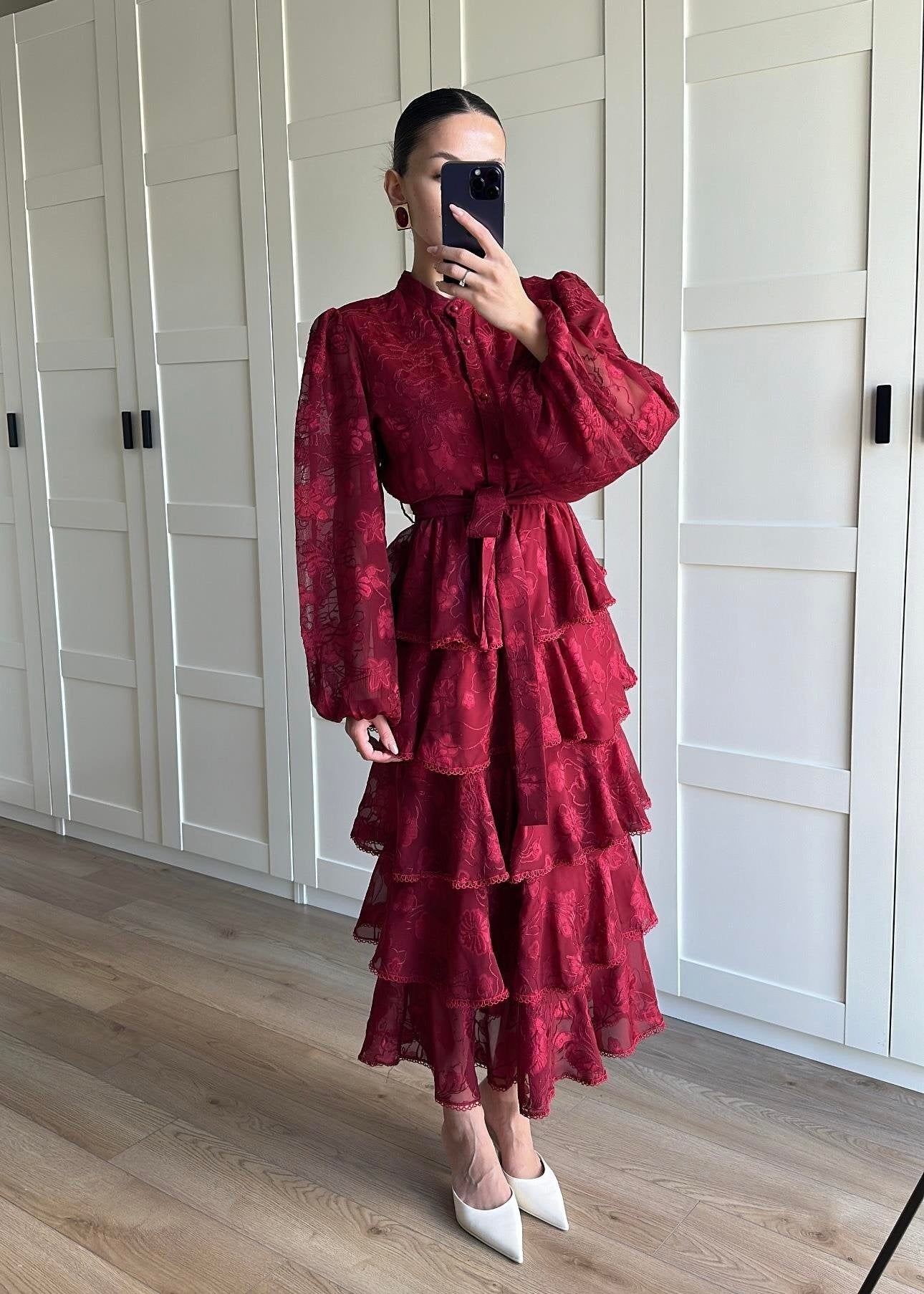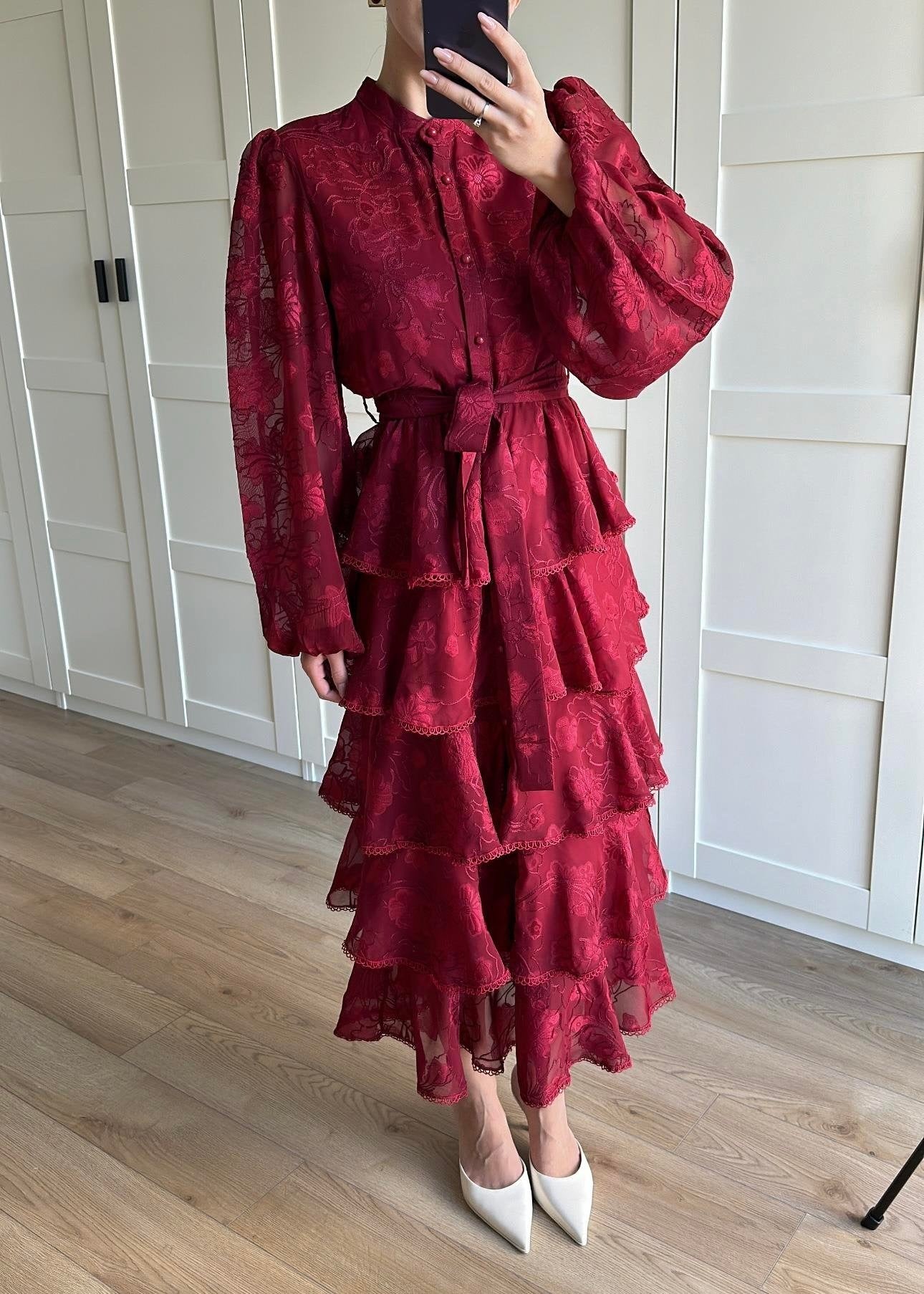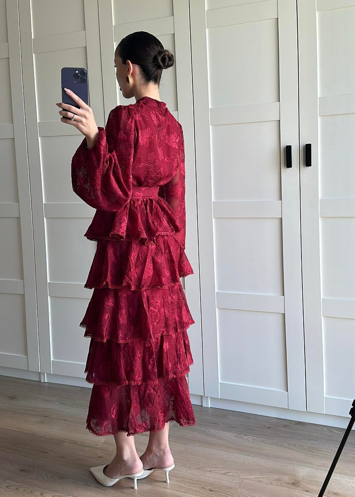 Çiçek Desenli Fırfırlı Elbise BORDO