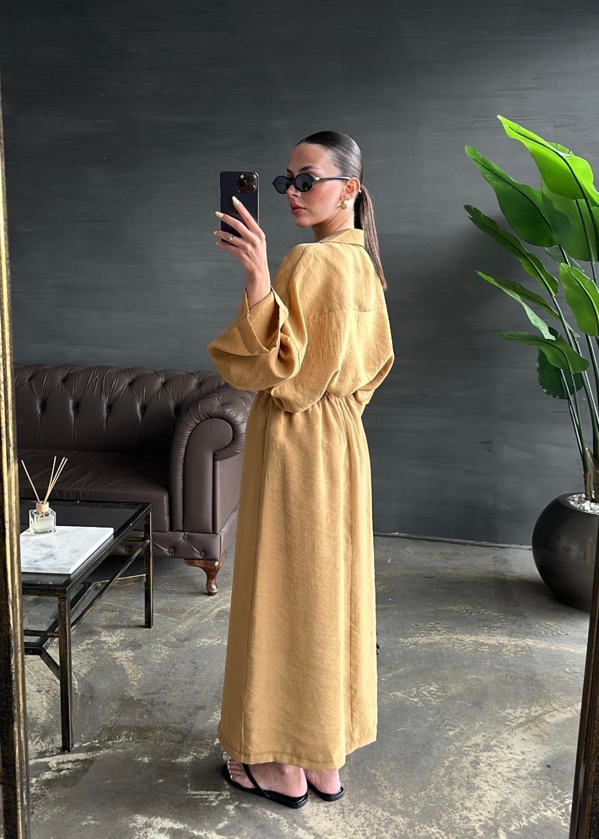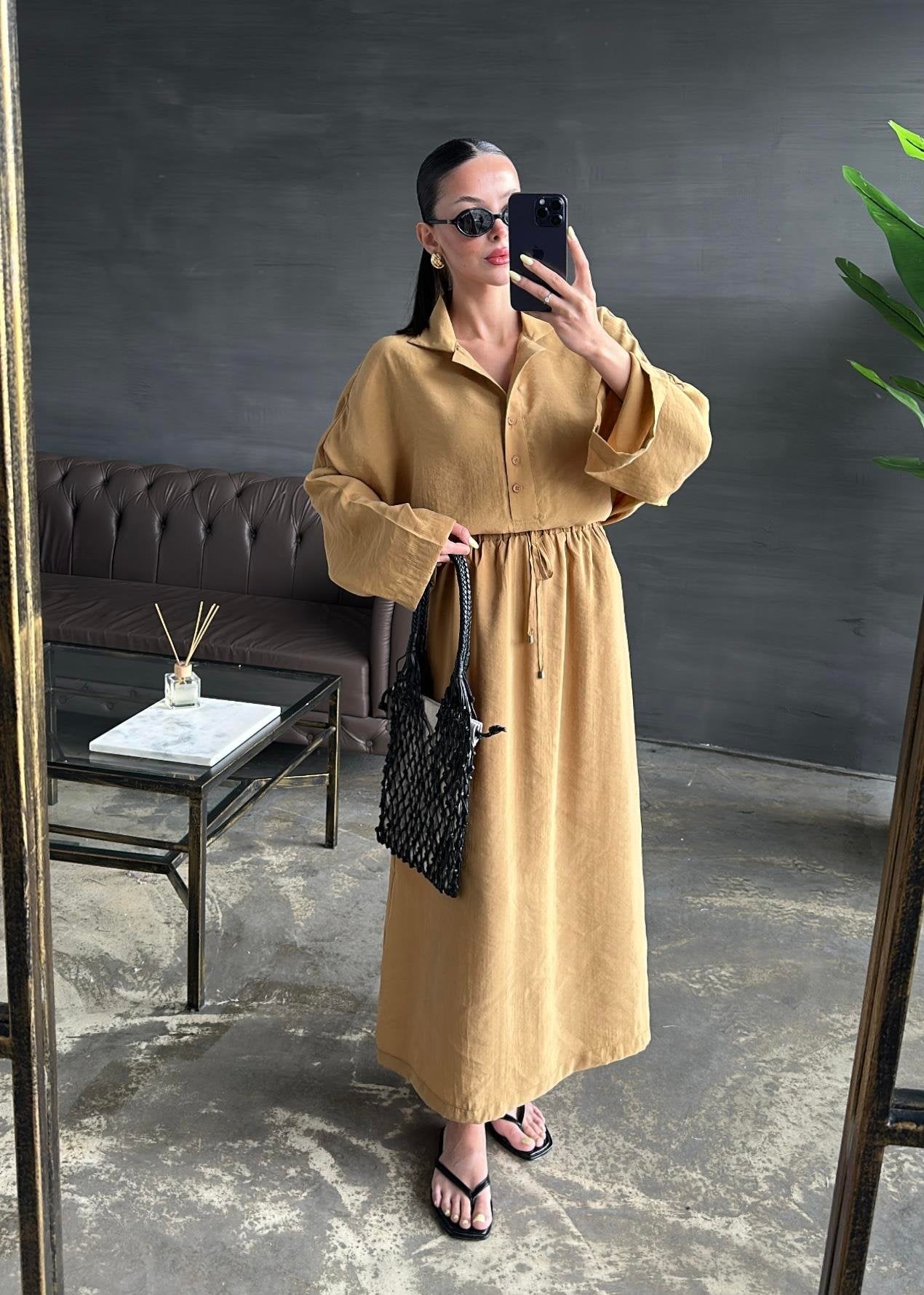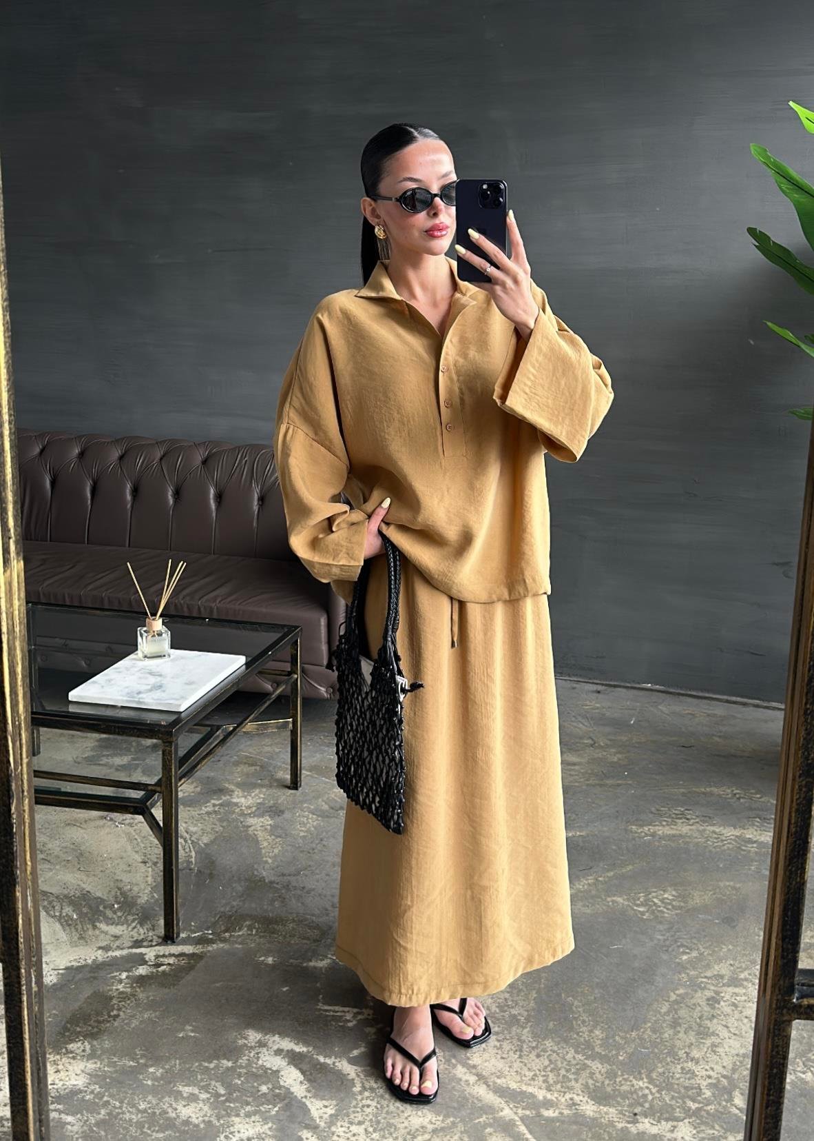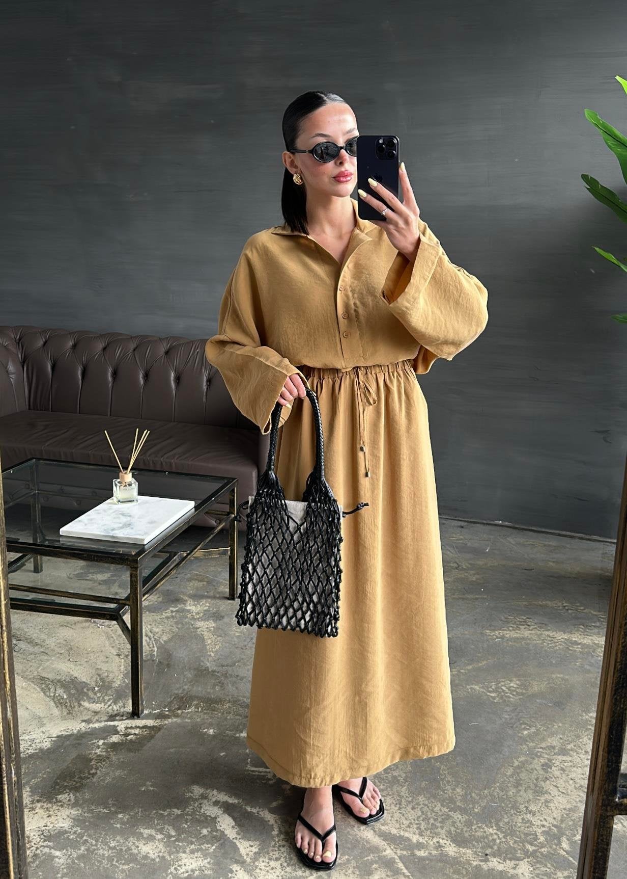 Çekimde S Beden kullanılmıştır. Tensel kumaştır. Etek beli lastikli ve ayarlanabilir iplidir.
