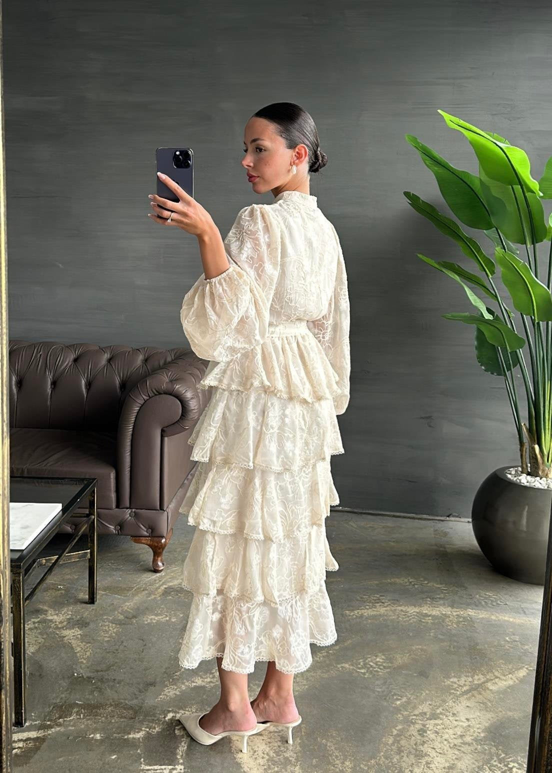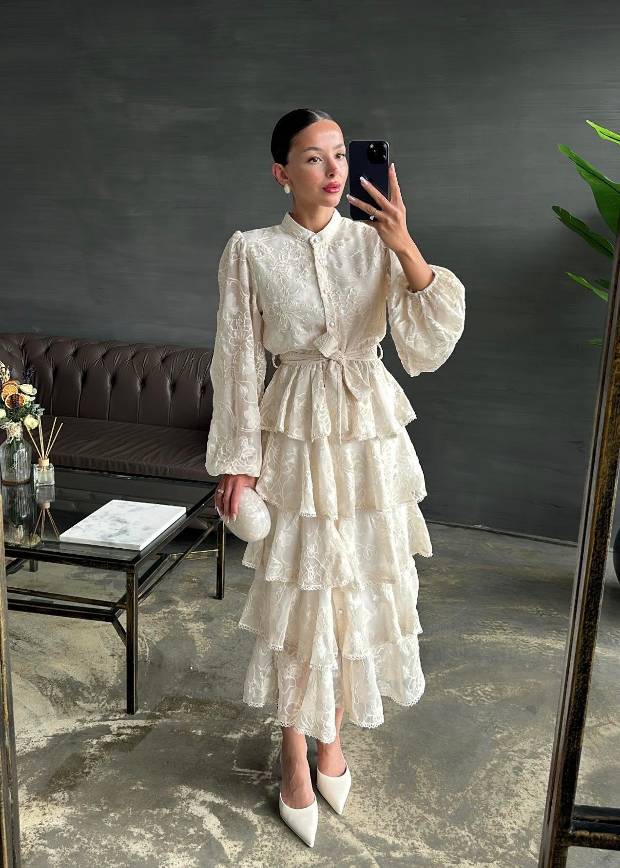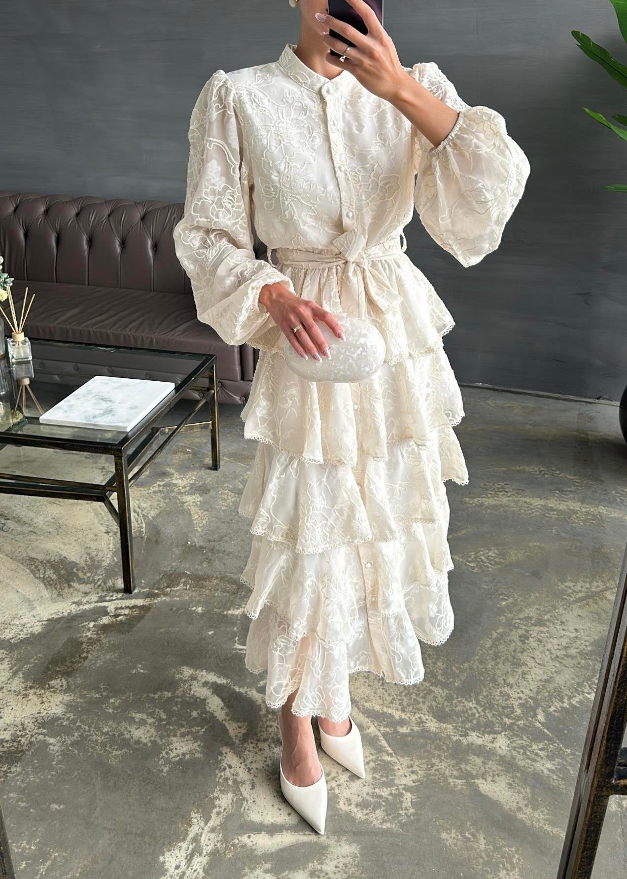 Çiçek Desenli Fırfırlı Elbise BEJ