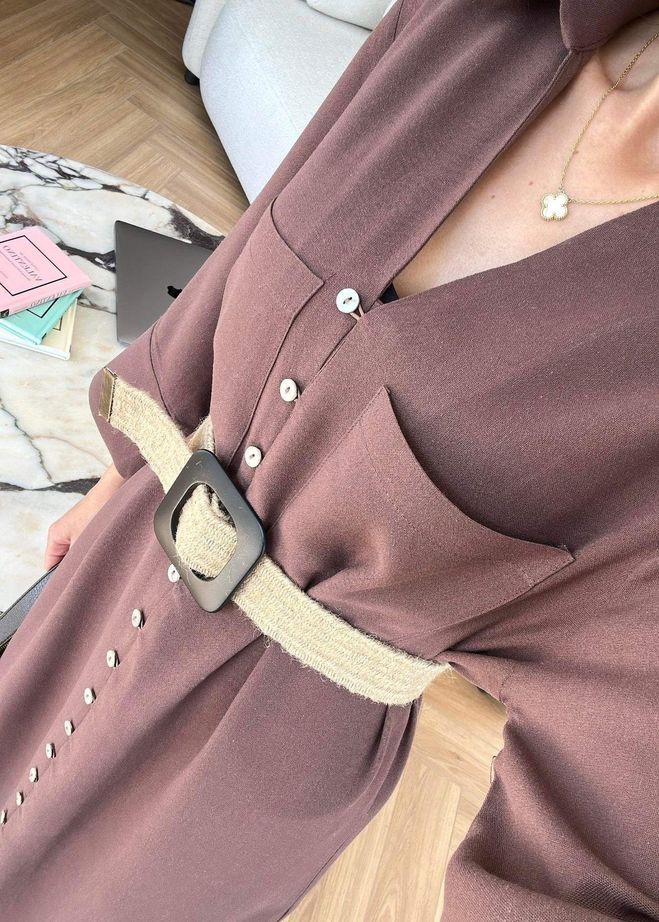 Hasır Kemerli Keten Gömlek Elbise KAHVERENGİ