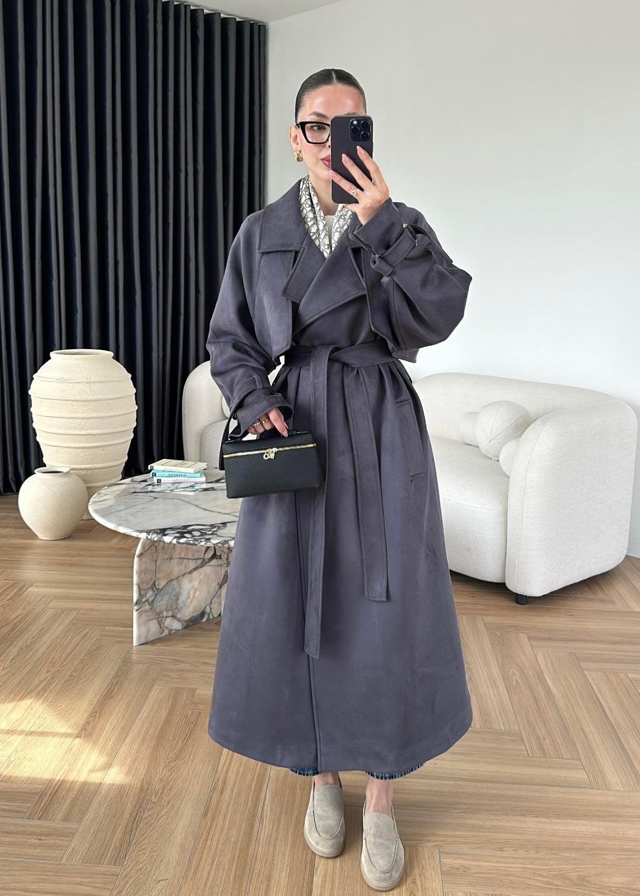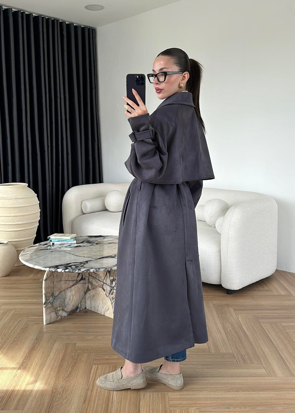 Apoletli Süet Trençkot ANTRASİT