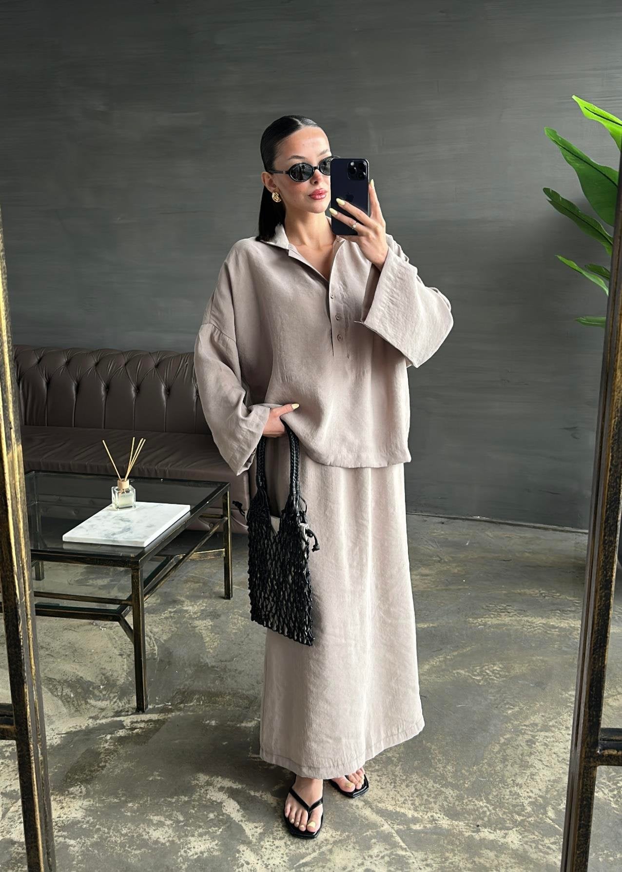 Çekimde S Beden kullanılmıştır. Tensel kumaştır. Etek beli lastikli ve ayarlanabilir iplidir.