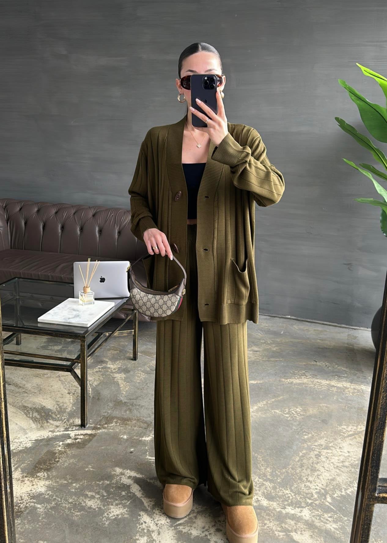 Ahşap Düğmeli Hırkalı Takım HAKİ