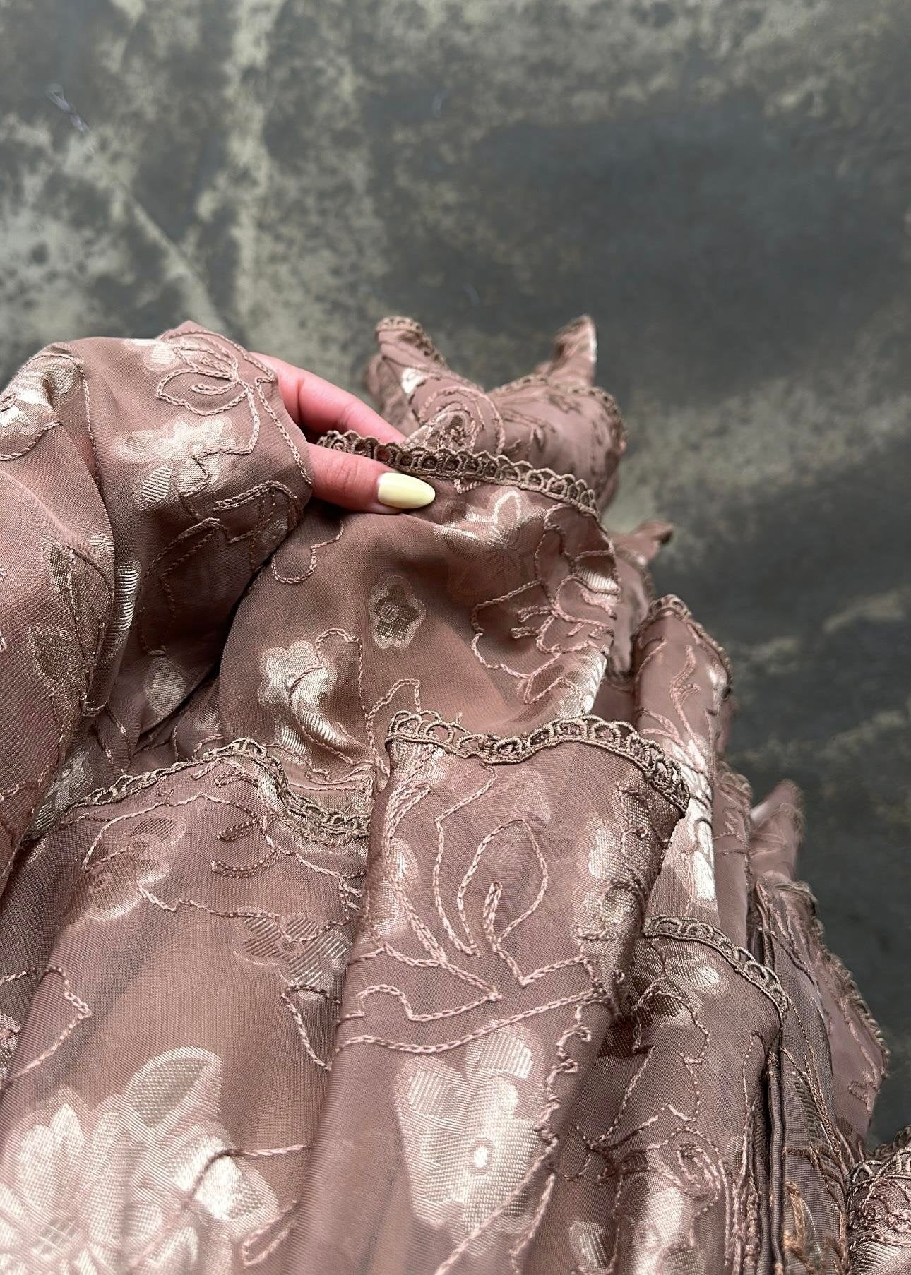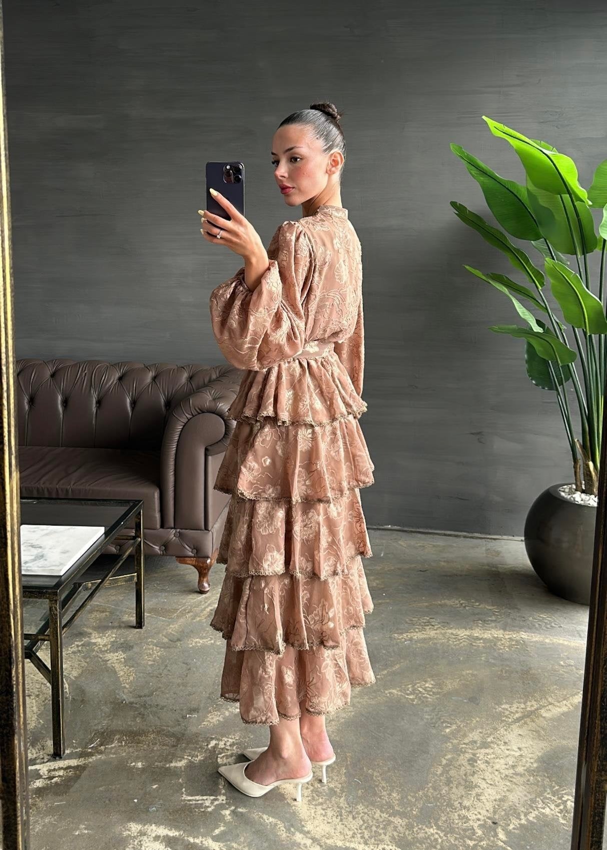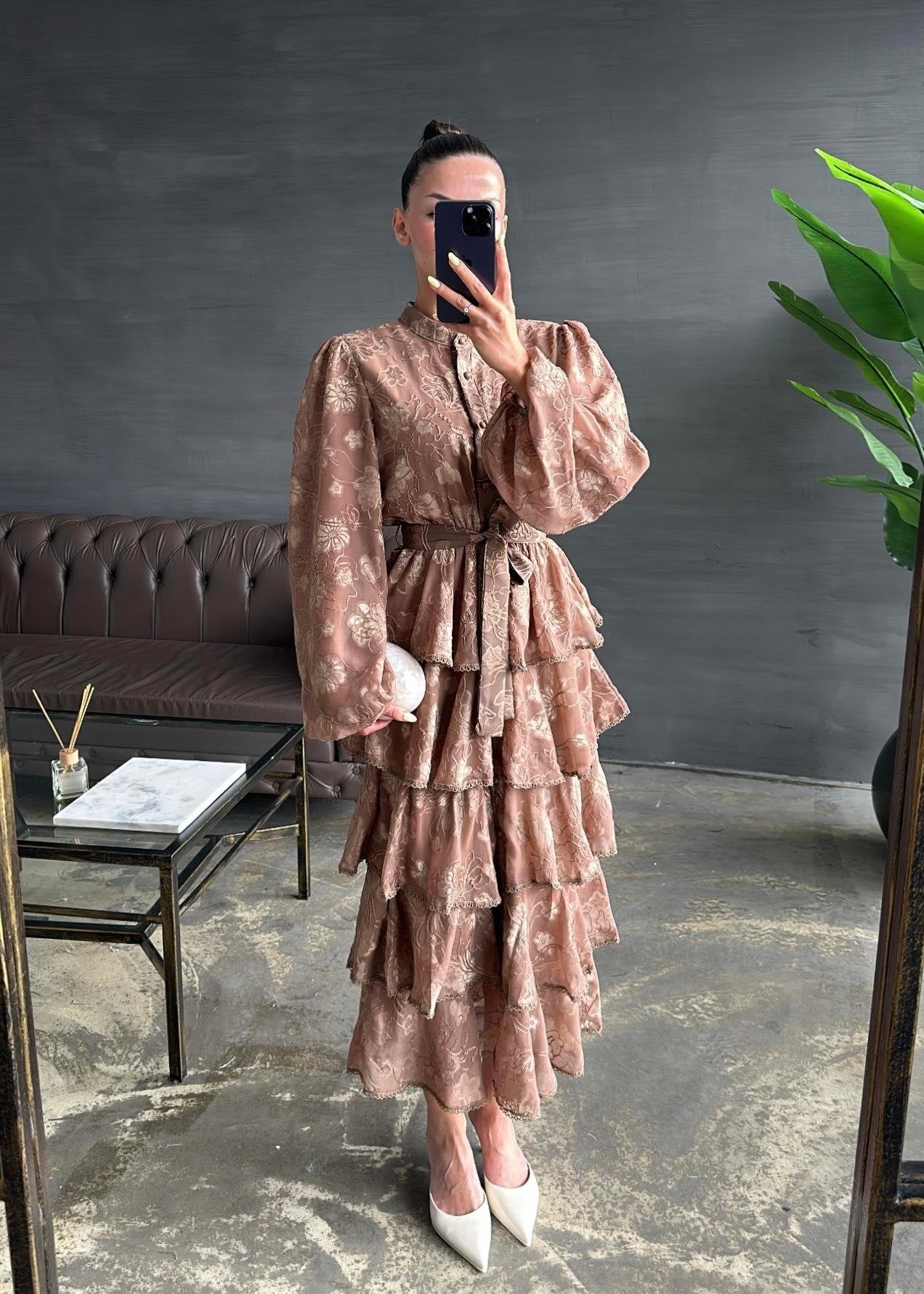 Çiçek Desenli Fırfırlı Elbise KAHVERENGİ
